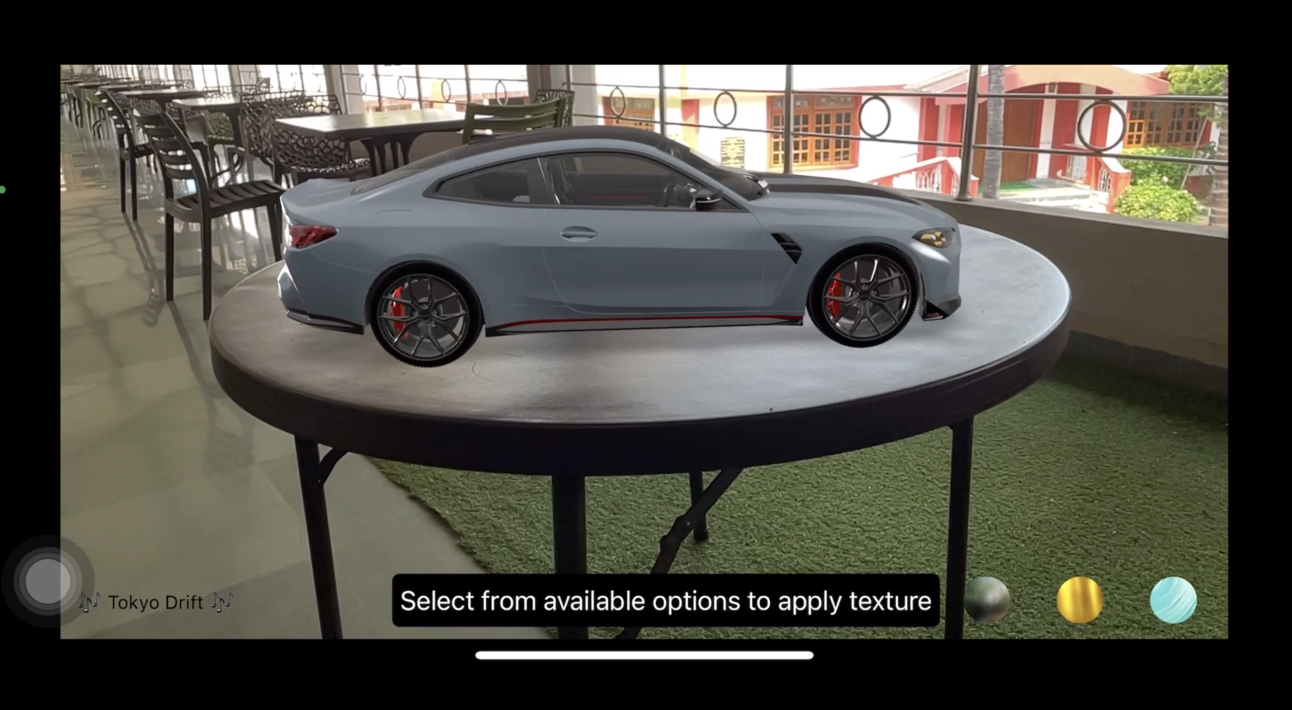 User has to scan the surrounding, once the horizontal surface is detected then user has to tap on the surface to place a 3D car model. Once the model is placed, surface scanning stops and a UI is populated with 3 spheres, each representing a different materials such as one sphere with a glass material, second sphere with a metallic material and third sphere with custom texture.